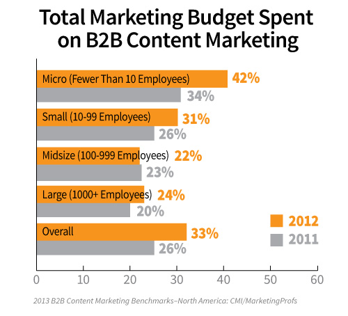 Companies of all sizes are doing it. This chart shows the total percentage of the budget spent on B2B content marketing. The across the board average is 33% and the percent age is highest in the smallest of the firms, the “Micro” category of firms with less than 10 employees. That’s right, even firms are small a few employees are implementing content marketing and they are spending an increasing amount on it. The “Micro” firms spend nearly half (42%) of their total marketing budget on content.