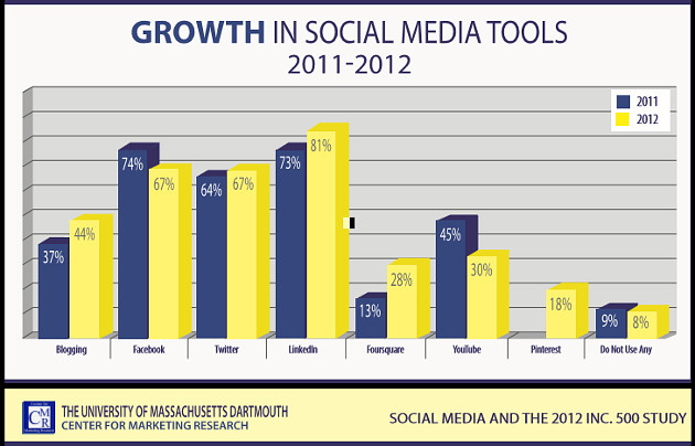 Trend #2: LinkedIn use is up 8%. LinkedIn was designed from day one as a business tool and it shows, as it has become the most popular tool with 81% of the Inc 500 using it. As the online resume site, designed initially to replace your Rolodex and keep up with your contacts, LinkedIn is all about content and professional interests. If you follow the latest trend toward “content marketing” especially in the business to business world, LinkedIn is uniquely situated to segment and deliver content to groups that are interested in that content.
